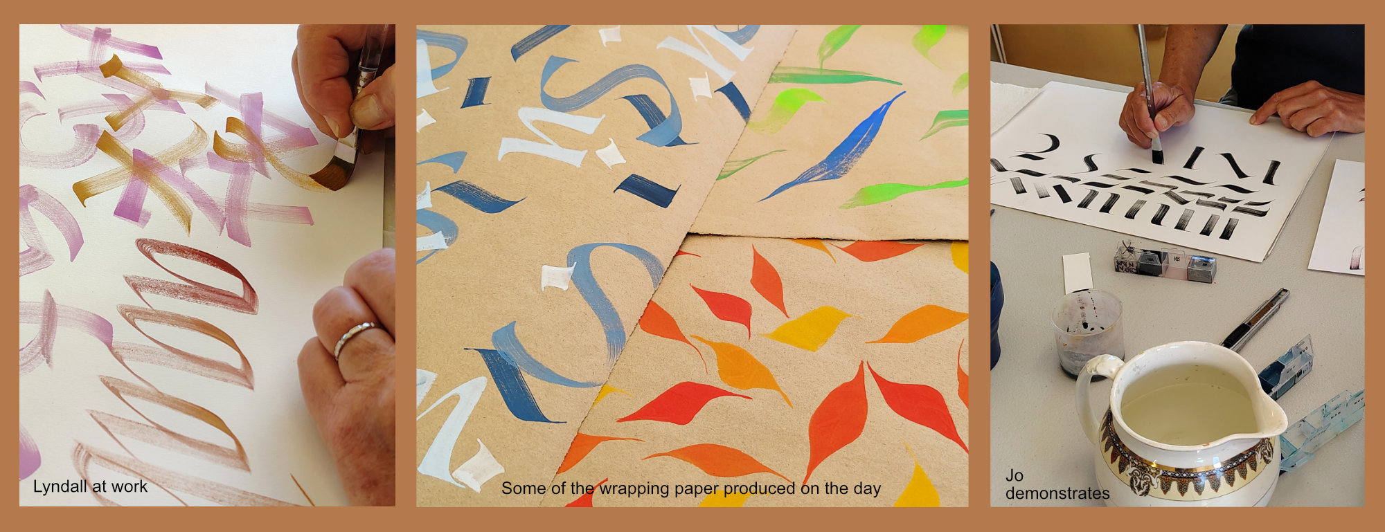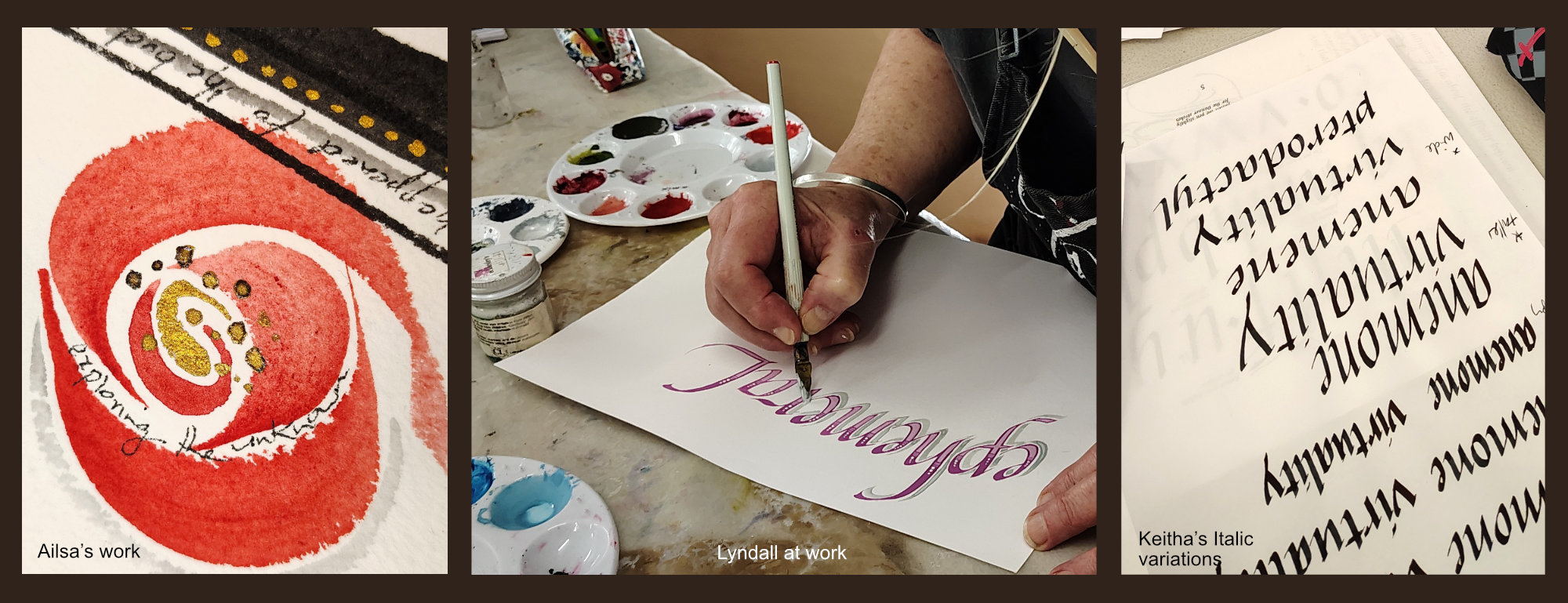 View our latest email bulletin: Lyndall’s morning workshop was delightfully inspiring, with useful prompts and open activities. We began with a look back to her previous Italic workshop and examples of traditional approaches. Thanks to Lyndall’s flexibility, everyone was able to practise the conventions of this beautiful hand and then take off in different directions. We used a range of writing instruments and media from pencils, broad nibs, folded pens and ruling pens, and from Sumi, Quink and walnut inks, to gouache, watercolours and pencils. It was exhilarating to see the possibilities as I walked round the room looking [...]