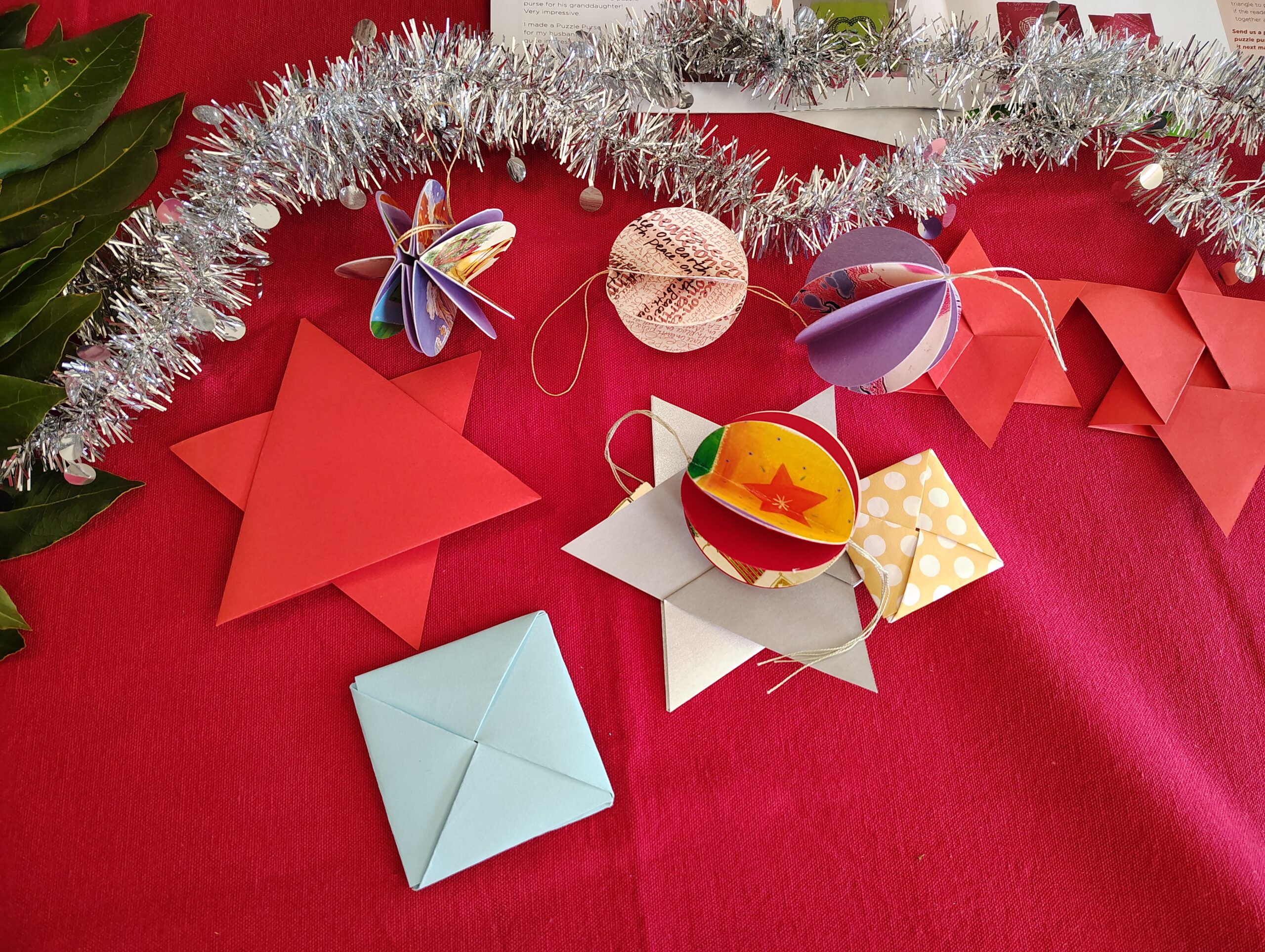 Our entrees this year were some Christmas craft activities. We made mind-boggling folded secret pocket purses with Keitha, six-pointed origami stars with Ailsa, and colourful paper Christmas baubles with Lyndall. Thanks to all of you for sharing these appetite-stimulating activities.